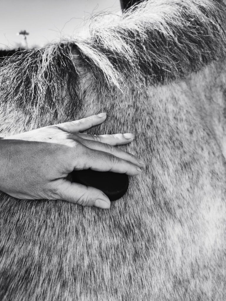 Le contact de la main qui masse apaise et vient recréer du contact physique social. En cela, il agit comme un véritable agent apaisant sur le psychisme du cheval.